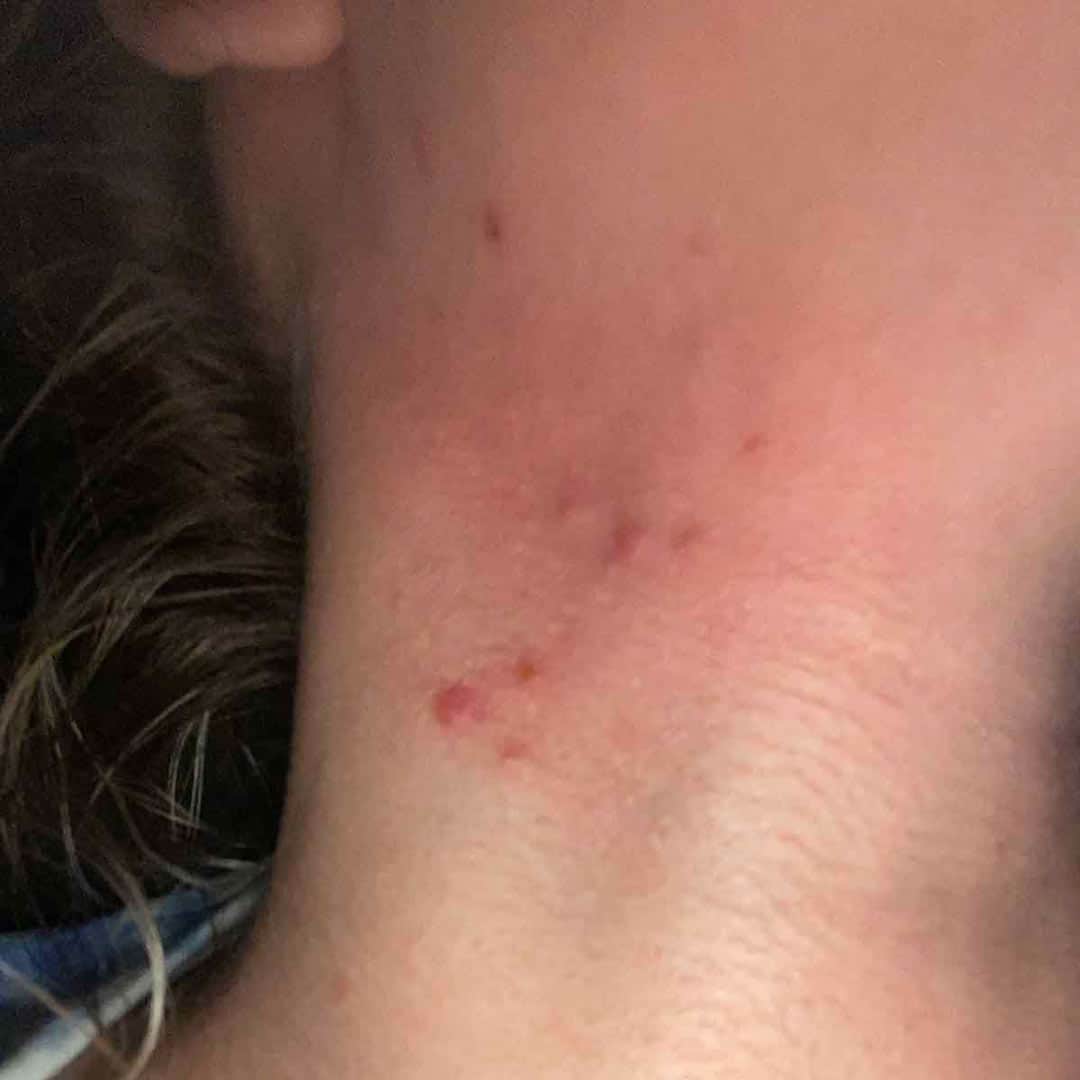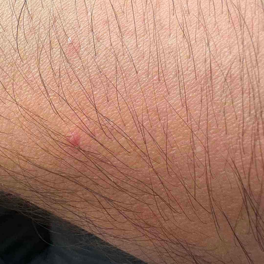 - Raised welts or bumps that may be skin-colored, brown, purple, or gray